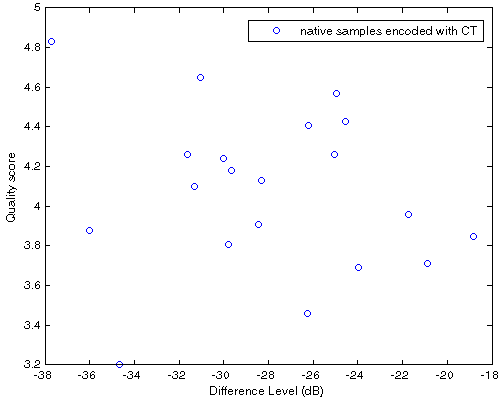 NB! Here we have the first disturbing surprise - loss of monotony of Df/QS dependency for two codecs (Nero, CT); both codecs have very similar nature of waveform degradation but lower Df values correspond to lower quality scores [should be investigated further].