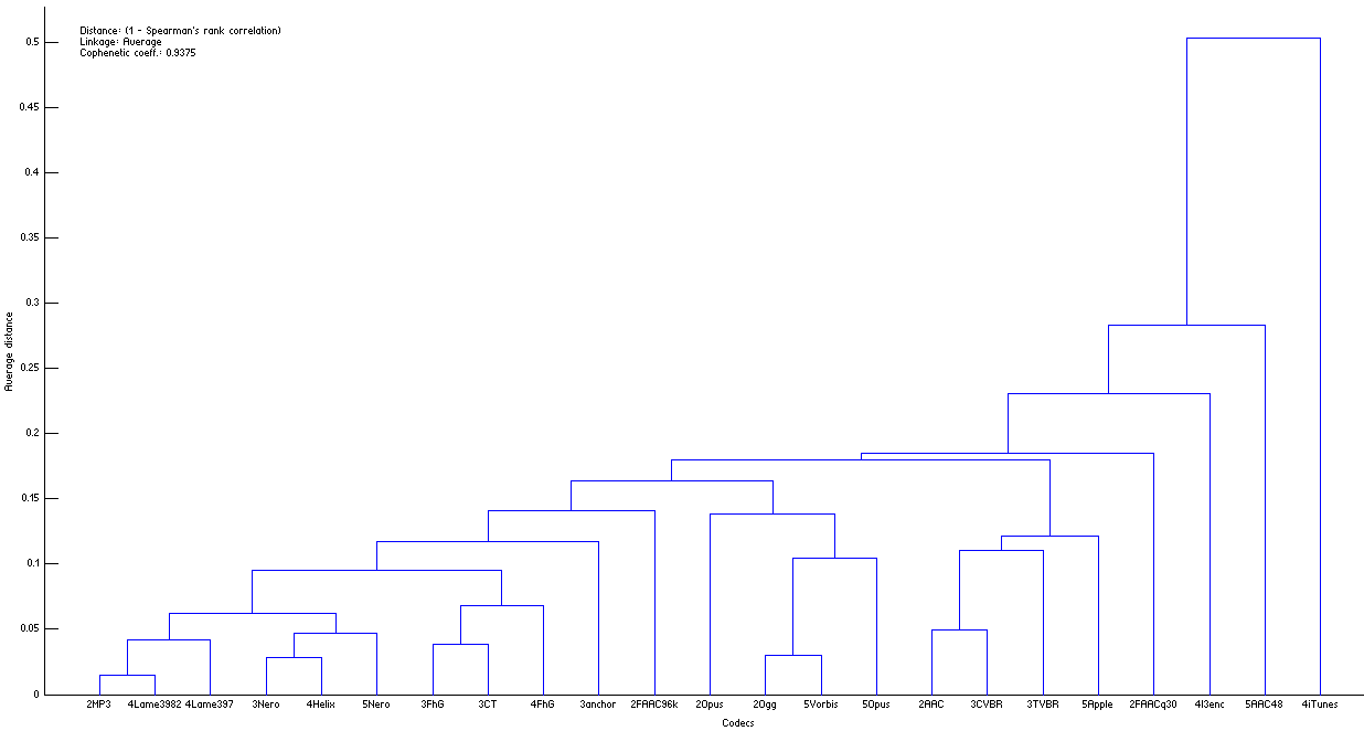 | Figure HA03. Dendrogram of distances between the codecs. It shows similarity of the codecs according to the way they degrade the initial waveform of The Random Mix (click the figure to enlarge). |